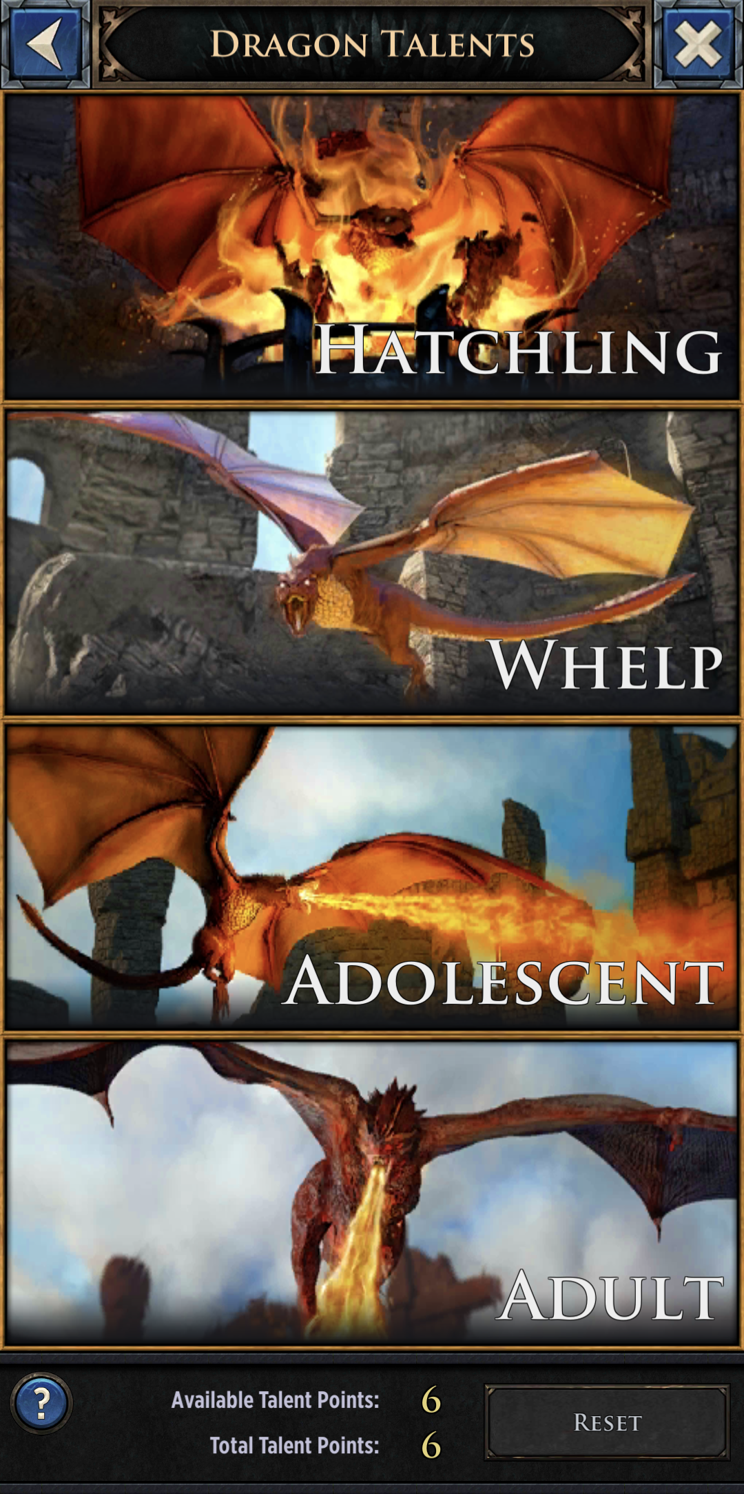 The current Talent categories are Hatchling, Whelp, Adolescent, and Adult. Each category focuses on the strength of your dragon at that stage.