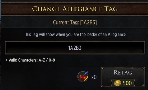Remarque : le tag d'allégeance doit comporter 5 caractères alphanumériques (A-Z, 0-9). Votre premier changement est gratuit, mais les suivants vous coûteront 500 pièces d'or.