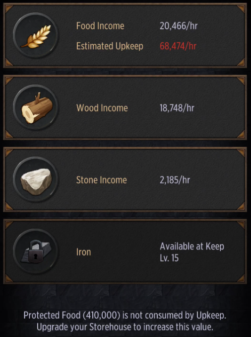 ゲームを開いたときや、兵士を行軍に出すときなど、維持費が定期的に差し引かれていることにお気づきになるでしょう。これは差額が表示されるまでのタイミングが変更されるためで、上記のアクションを実行することで、予定よりも多めの維持費が消費されるわけではありません。